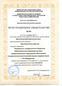 Журнал зарегистрирован во ФГУП НТЦ "Информрегистр", номер государственной регистрации 0421200165. Регистрационное свидетельство № 541 от 13 октября 2011 г.